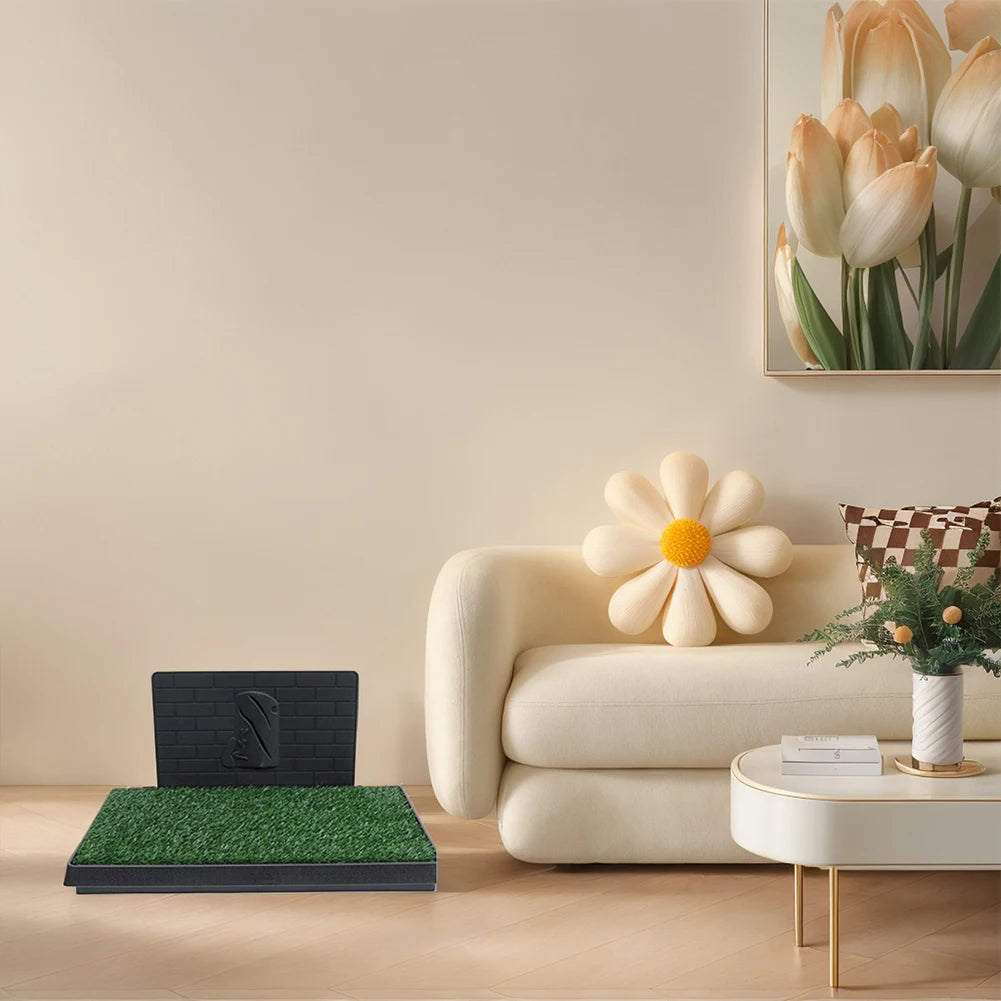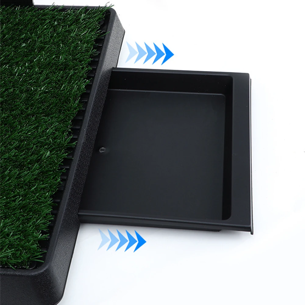 1. Innovative Biophilic Design: The dog grass pad with large tray features a three-layer system with a sloped bottom tray and a ribbed design that captures urine and directs it through drainage holes into a collection box for easy disposal. The upgraded biophilic wall is for guide dogs and prevents urine splashes, making the puppy turf potty easy to clean and maintain.